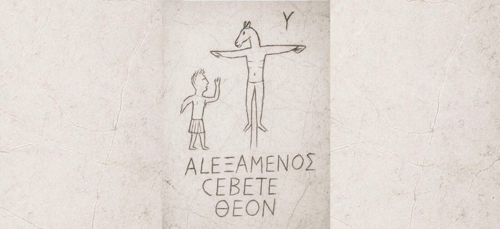 예수 그리스도의 십자가 처형을 묘사한 가장 오래된 기록은 교회의 보물이 아니라 순전한 조롱이었습니다. 로마 중심부 팔라티노 언덕에서 황실 시종 숙소 벽에서 발견된 벽화(2세기 후반~3세기 초)는 낙서였습니다. 그것은 십자가에 못 박힌 당나귀 머리를 한 인물이 그려져 있었습니다. 그 옆에는 기도하는 사람과 “알렉사메노스가 [그의] 신을 숭배한다”는 뜻의 그리스어 비문이 적혀 있는데, 이것은 모욕을 의미한 것입니다.
